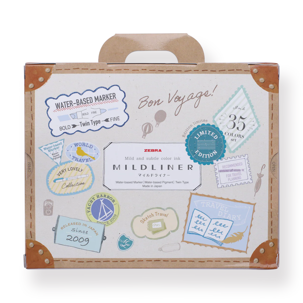 *This set contains all the colors of Mildliner! Inspired by the traveling theme, the limited edition Mildliner gift set comes in a vintage suitcase design and carries the full 35 colours of the popular journal essentials. In the gift box, it has 3 subsets including 3 different colours series, Traveling by Air, Traveling by Train, and Traveling by Cruise Ship.